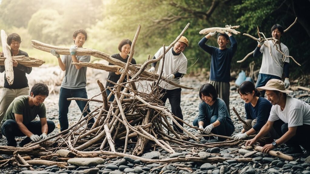 設計図はありません。 流木を拾い集める人、石を積み上げる人、泥で形を作る人。