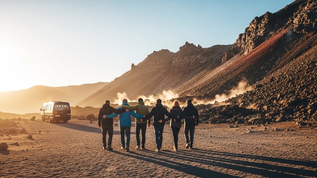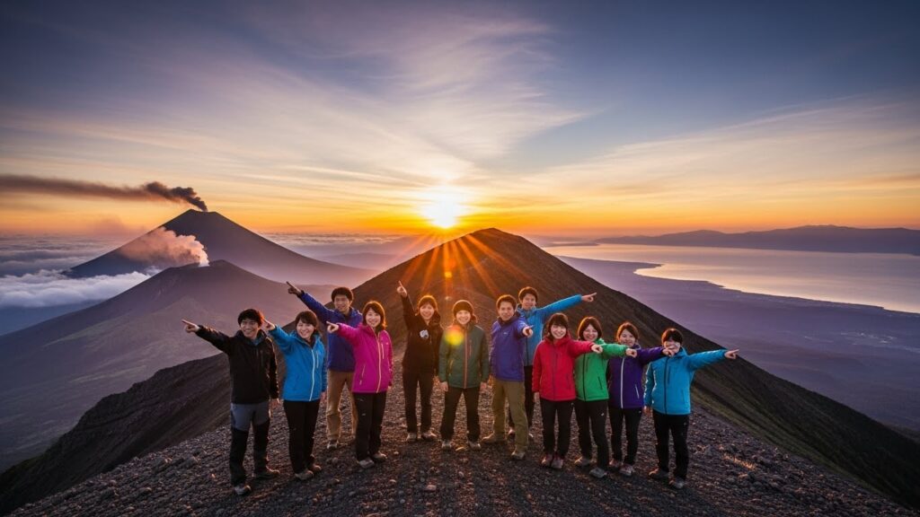 早朝、活火山を望む丘の上でミーティングを行います。 眼前に広がるのは、数万年前から活動を続ける山と、見渡す限りの地平線。 人間の営みなど一瞬の瞬きに過ぎないと感じさせる、圧倒的なタイムスケール。