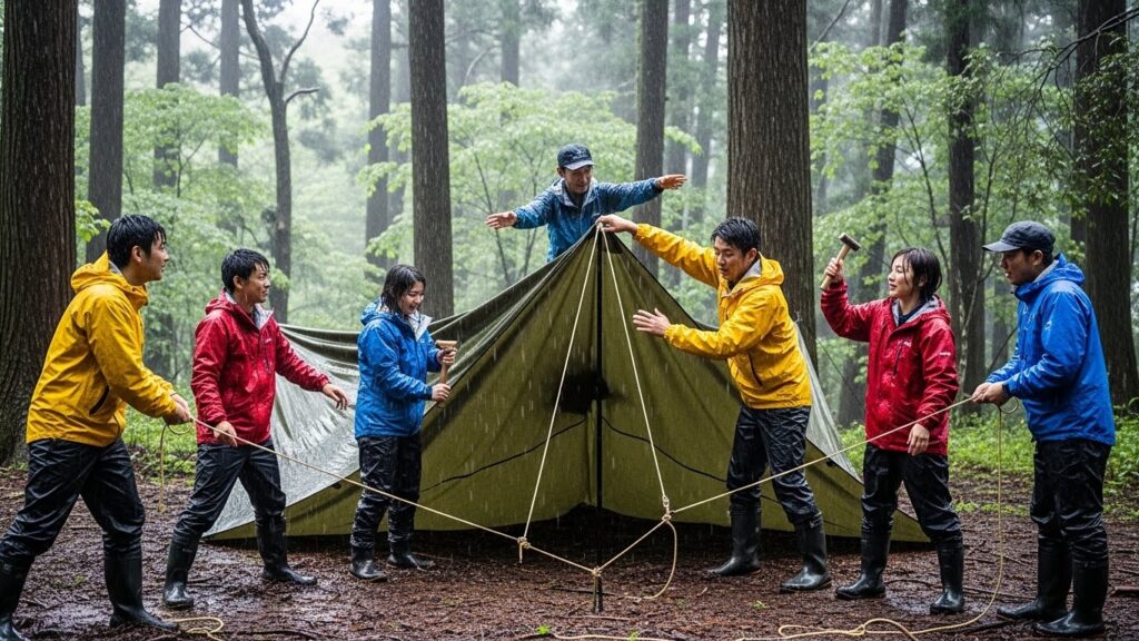 「雨が降ったなら、濡れないようにタープを張ろう」 「逆に、雨音を聞きながらの会議も集中できるかもしれない」