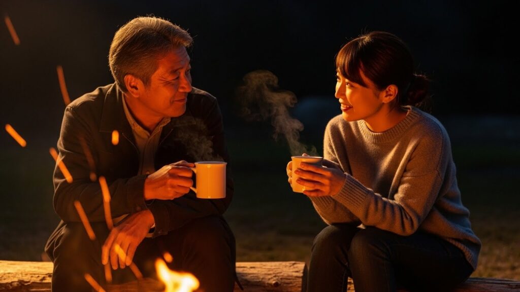 スーツではなくアウトドアウェアを着て、同じ火を見つめながら、肩を並べて語り合う。 そこには「評価する側/される側」の関係はありません。 ただの「人間同士」の対話です。