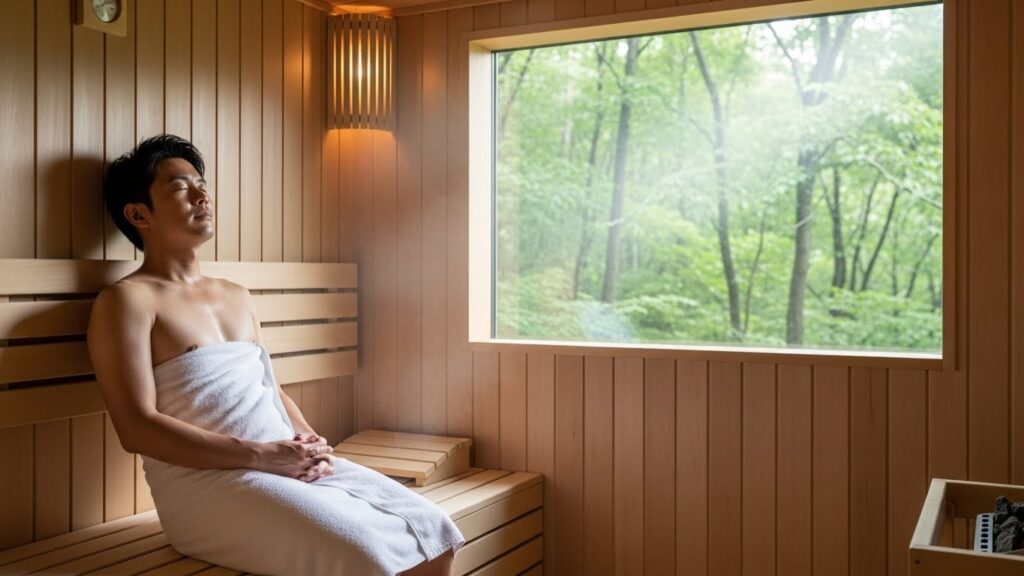 温泉の熱と、森の冷気を行き来する温冷交代浴(サウナ)。 「ととのう」感覚の中で、自律神経のバランスが整っていく。