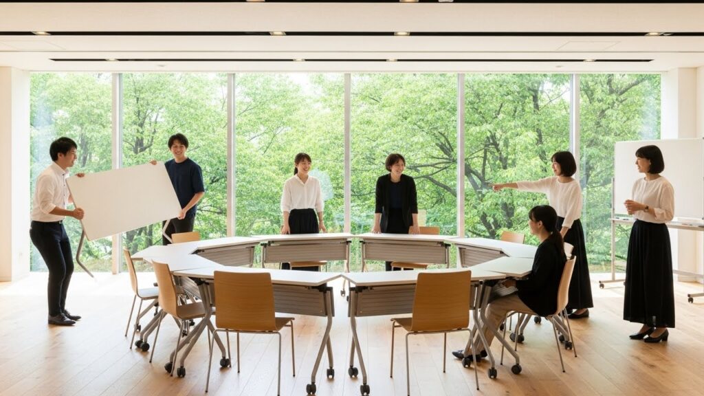 従来のスクール形式(講師に向かって机が並ぶ形)は、知識のインプットには効率的ですが、現代の研修で重視される「対話」や「共創」には不向きです。固定されたレイアウトは、思考までも固定化させてしまうからです。