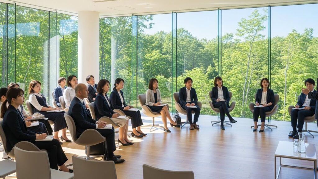 周囲は深い森。聞こえるのは川のせせらぎだけ。都市のノイズが一切遮断されたこの環境では、参加者は強制的に「今、ここ」に集中せざるを得ません。講義中の議論はもちろん、休み時間の立ち話、食事中の会話、移動中の風景、そのすべてが研修のテーマとリンクし、脳内で反芻され続けます。