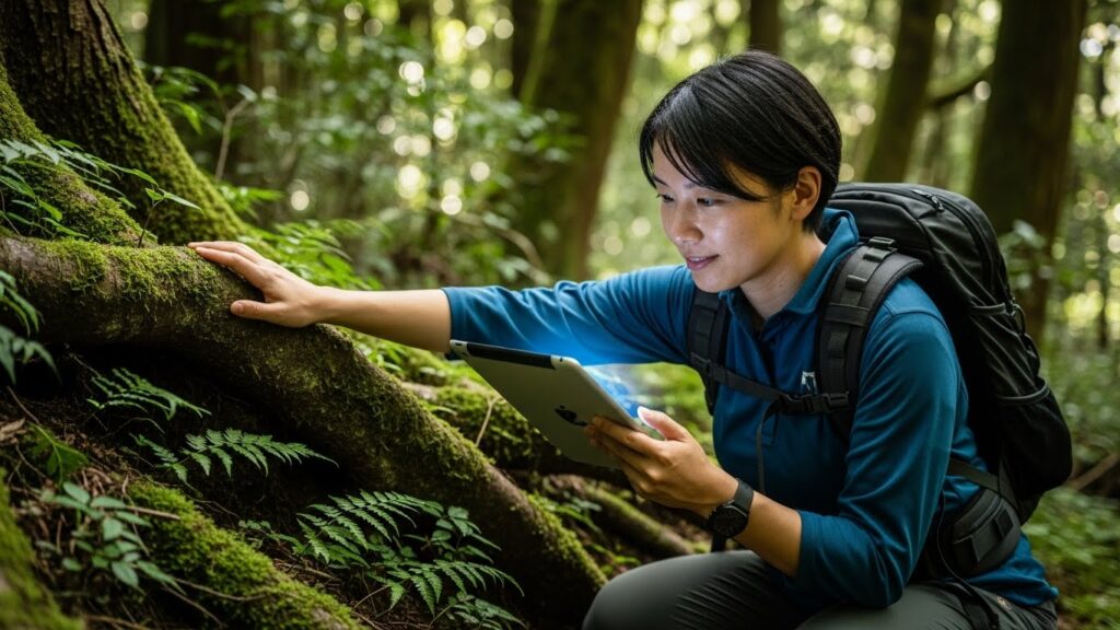参加者は、ウェアラブルデバイスやイヤホンを装着し、森の遊歩道を散策します。 歩きながら、思いついたアイデアをAIに投げかけます。 「今、目の前に巨大な倒木があるんだけど、これを障害物じゃなくリソースと捉えるビジネスモデルはあるかな?」