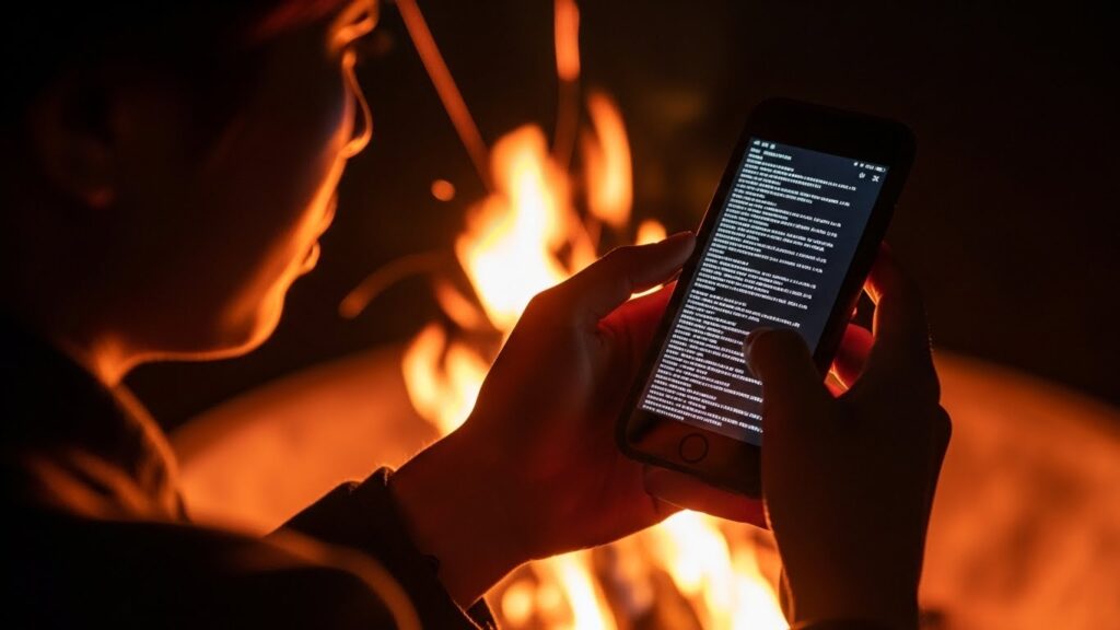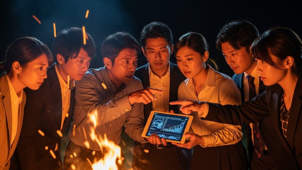 夜、焚き火を囲みながら、AIが出した「究極の戦略プラン」について討論します。 「AIは、不採算部門の即時撤退を推奨している。数字上は正しい。だが、本当にそれでいいのか?」