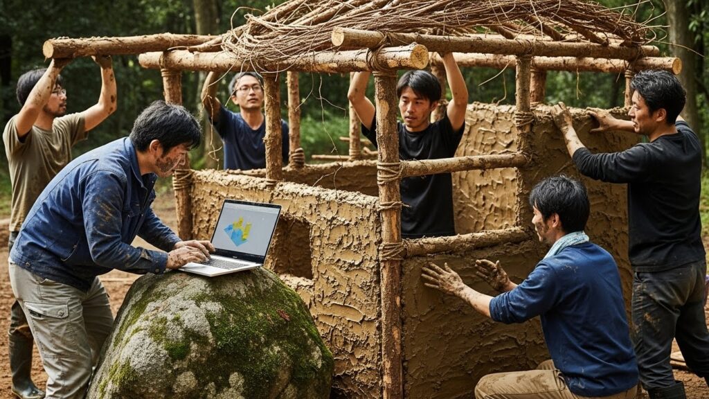 「AIと一緒に考えた『未来の住居』を、この森にある素材で実際に作ってください」 参加者は、タブレットでAIに構造計算やデザイン案を出させつつ、実際の手で木を切り、土を練り、組み立てます。