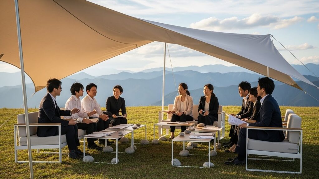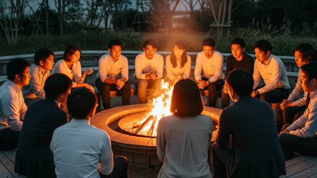 「部長」ではなく「一人の人間」としてそこに座る。 炎のゆらぎが、沈黙さえも肯定的な時間に変えてくれる。 ここでは、パワーポイントの資料は役に立ちません。 語り手自身の「言葉の重み」だけが試される。 組織の階層構造を物理的に無効化するこのフォーラムが、真の対話を引き出します。