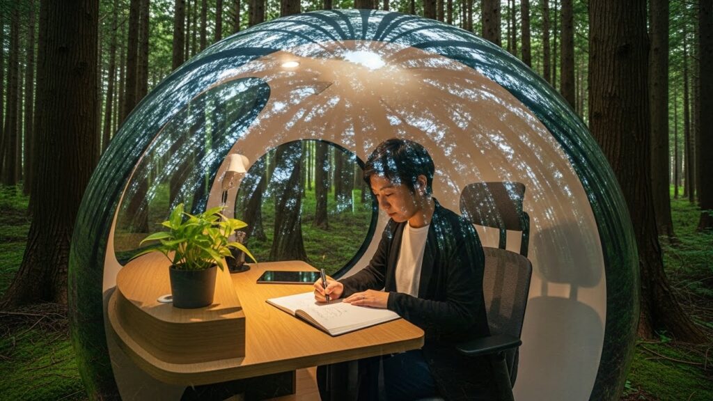 森の奥深くに点在する、個人用ワークポッド。 ガラス張りの小さな空間は、外部の音を遮断しつつ、視覚的には森と一体化しています。