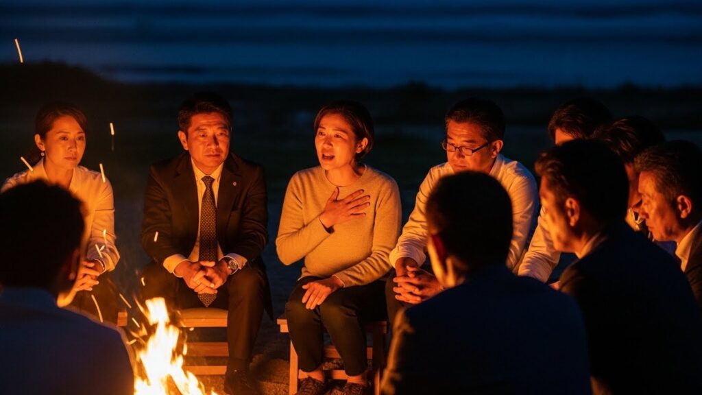 マグマリゾートの夜。戦略合宿のハイライトは、焚き火を囲んでの対話です。 ここでは、昼間の会議で出た戦略案について、それぞれの「想い」を語り合います。