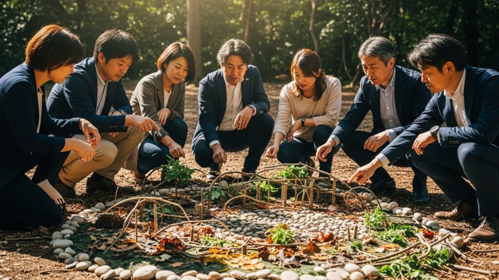 あるいは、言葉を使わずに、拾った枝や石で未来の組織図を表現してみる。 身体感覚や直感を使うことで、言語化以前の「ありたい姿」が浮かび上がってきます。