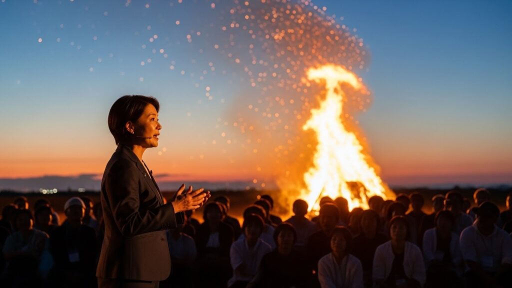 スーツという鎧を脱ぎ、役職というタグを外す。 炎の前では、ただの「人間同士」です。