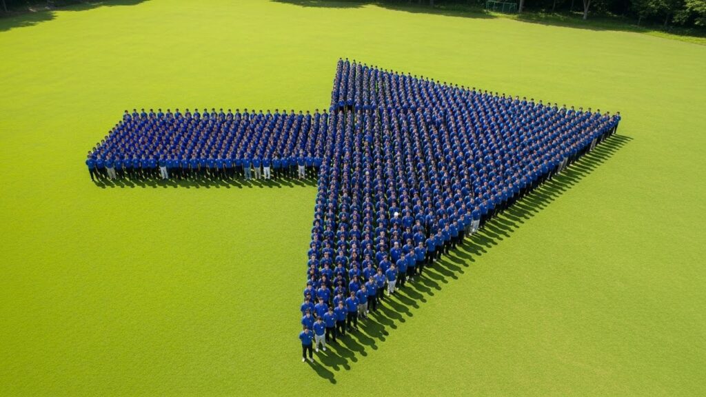 物理的に配置につくことで、組織図やバリューチェーンが身体感覚としてインストールされます。 ドローンで上空から撮影した、全員で描いた「矢印」や「円陣」。 その映像をその場で共有する。