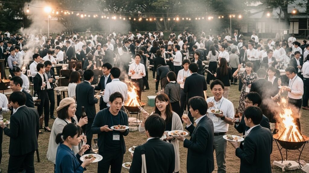 「今夜は無礼講! 全員で同じ火を囲もう!」 会場は、無数の焚き火が点在する広場です。 テーブルはありません。丸太の椅子か、芝生の上です。