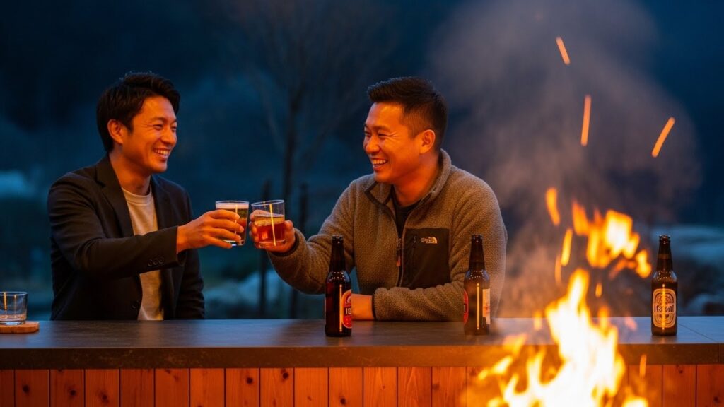 そんな何気ない会話から始まり、焚き火を見つめながらグラスを傾けるうちに、話題は自然と深くなります。