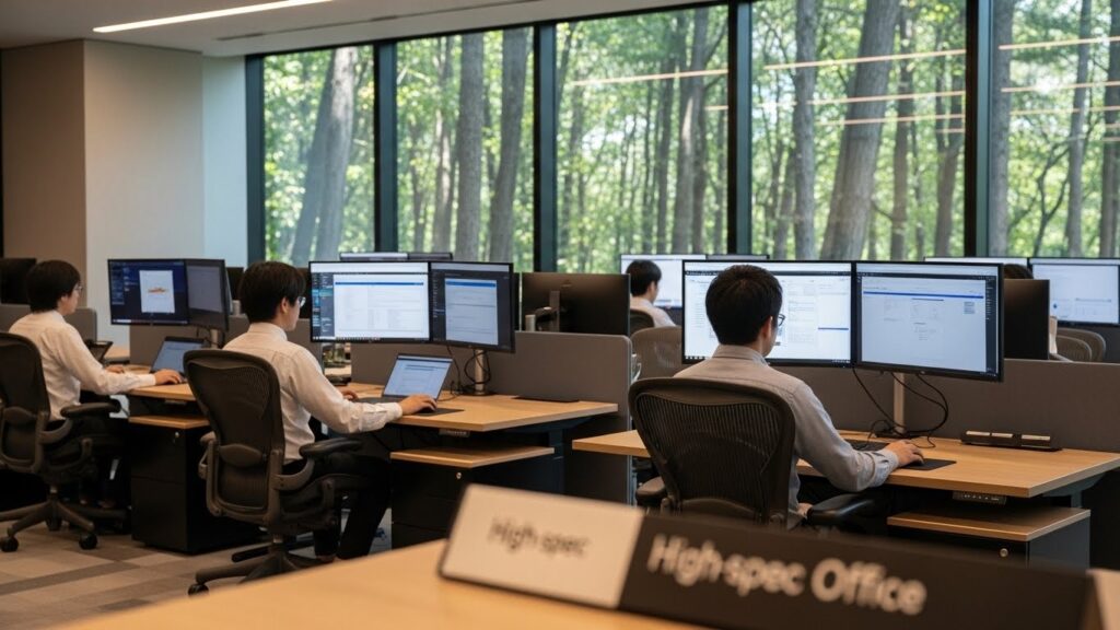 IT企業のエンジニアやクリエイターにとって、通信環境は生命線です。 そのため、当施設では全域に「Wi-Fi 6」を完備し、大容量データの送受信もストレスなく行えます。 具体例として、森を望むコワーキングスペースには、ハーマンミラー社のチェアや昇降デスク、大型モニターを導入しています。