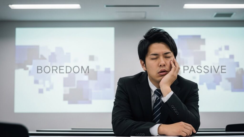 例を挙げると、スクール形式で講師の話を聞くスタイルは、彼らが小中高大と続けてきた「授業」と同じです。 こうした環境では、無意識のうちに「先生が答えを教えてくれる」という受け身の姿勢(生徒気分)になります。 したがって、言われたことはやりますが、想定外の事態にはフリーズしてしまいます。 具体的に言えば、自ら課題を見つけ、解決するプロセス(PDCA)を回す経験が圧倒的に不足しているのです。
