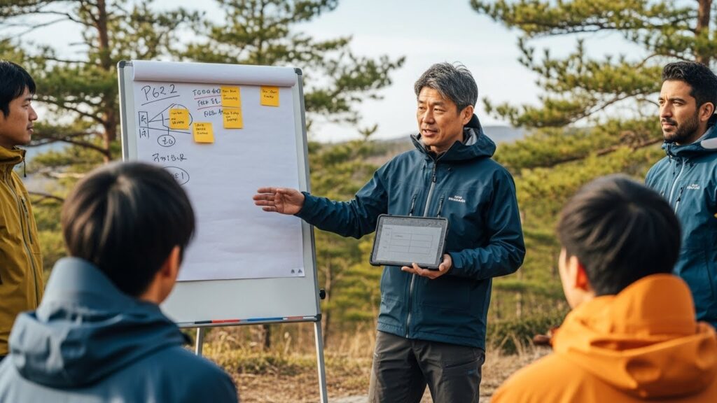 地図とコンパスを頼りに、広大なフィールド内のチェックポイントを回る競技です。 ポイントは、制限時間内にどれだけ高得点を稼げるかという「戦略性」です。 「難易度は高いが高得点の山頂を目指すか」「確実な平地を回るか」。 チーム内で意見が割れた時、リーダー役がいかに合意形成を図り、決断を下すか。 そのプロセスをプロのファシリテーターが観察し、フィードバックを行います。