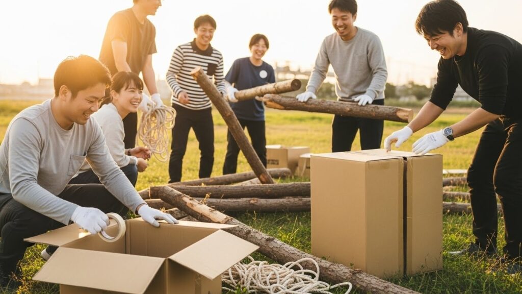 普段はキーボードを叩いている指で、のこぎりを引き、ロープを結ぶ。 「仕様変更だ!」「デプロイ(設置)失敗!」 専門用語を交わしながら、泥だらけになって物理的な構造物を作る。