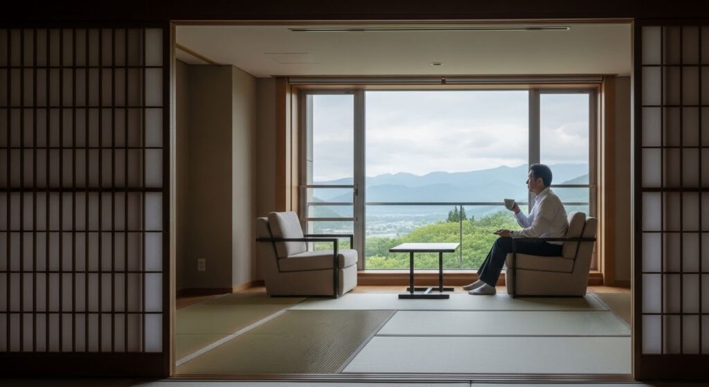 ご宿泊いただくのは、お一人様7万円という価格帯にふさわしい、上質さを極めた空間です。 広々とした客室、静寂の中で聞こえる風の音、肌を滑る源泉掛け流しの湯。研修の疲れを癒すだけでなく、思考を深めるための「装置」として機能します。