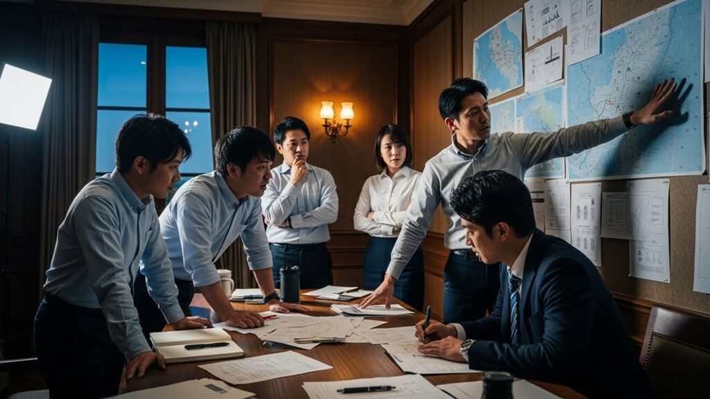 舞台は、リゾート内の貸切ヴィラ(War Room)。 壁一面に地図や模造紙を貼り出し、模擬戦を開始します。