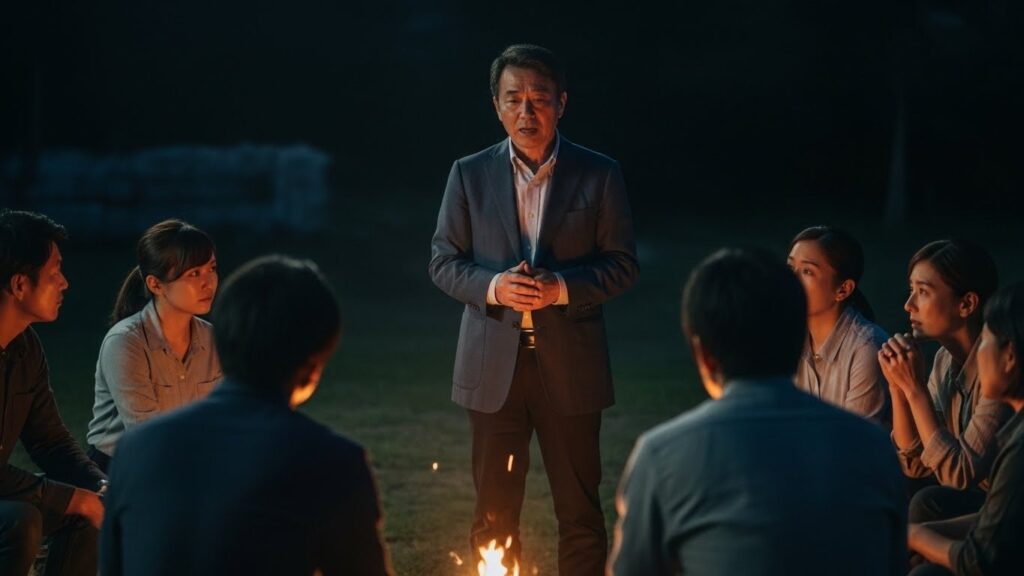 夜、焚き火の周りで行うのは、あえて**「会社が倒産するシナリオ」**を語り合うセッションです。 暗闇と炎の演出が、深層心理にある不安を引き出します。