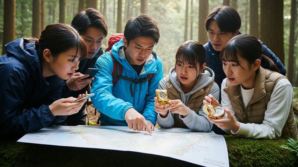 合宿の初日、新入社員たちはスマホを没収されます。 渡されるのは、紙の地図とコンパスだけ。 「ゴール地点にある『伝説の湧き水』を汲んできてください」というミッションが与えられます。