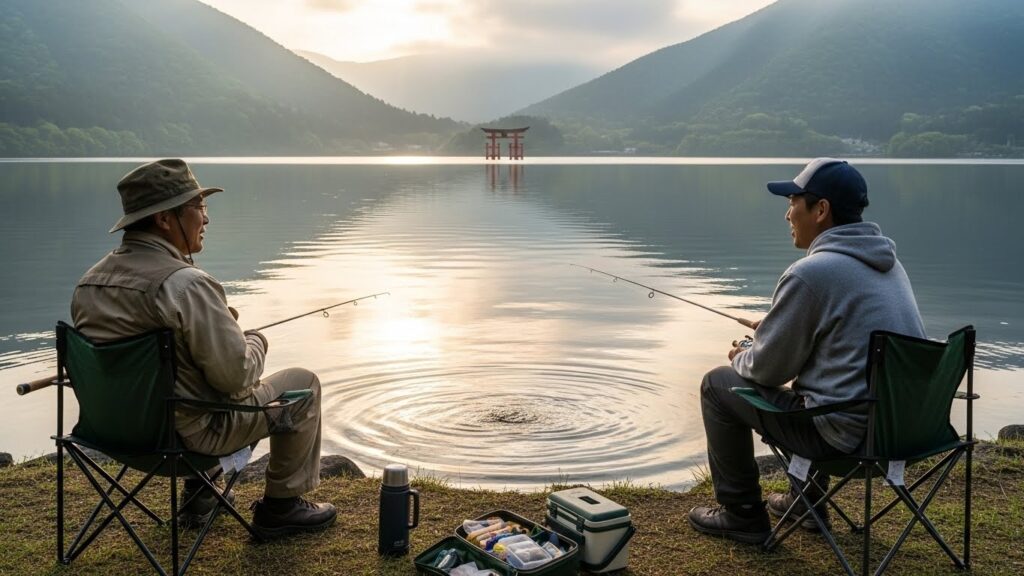 - 釣り: 糸を垂らし、同じ湖面を見つめる。