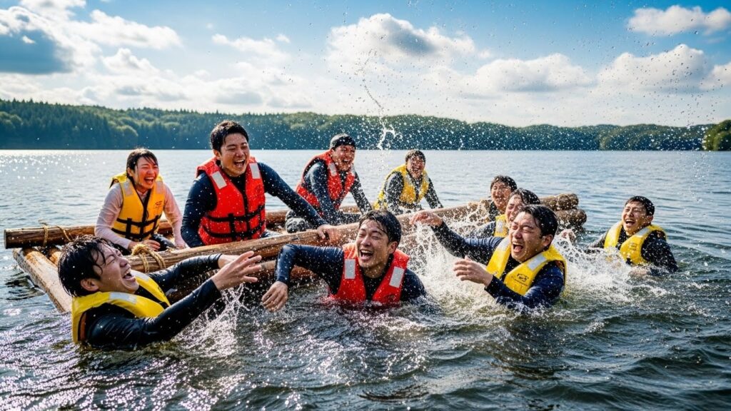 マグマリゾートのアクティビティは、一発で成功しないように設計されています。 例えば、「巨大いかだ作り」。 ロープの結び方が甘ければ、いかだはバラバラになります。 しかし、湖に落ちても、誰も怒りません。むしろ、ずぶ濡れになった姿を見て大笑いします。