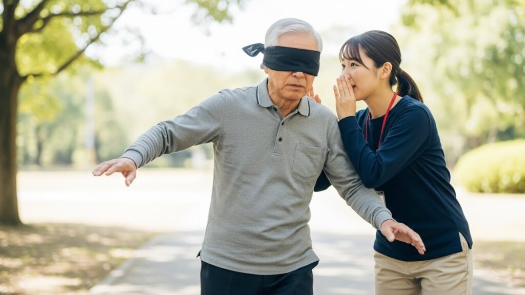- アクティビティ: 「ブラインド・サッカー体験」。目隠しをした役員を、若手社員が声だけで誘導する。