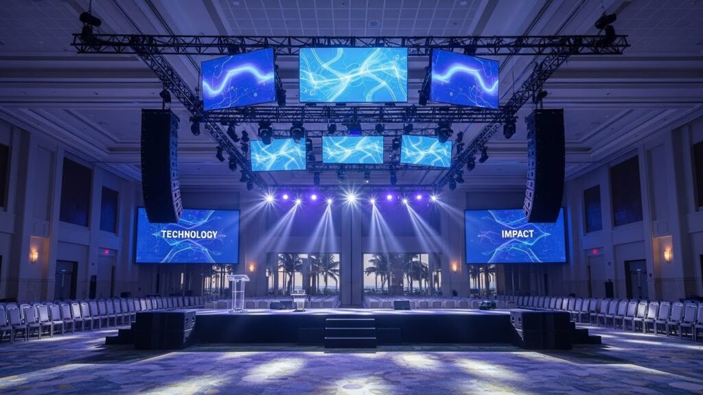 言葉だけで人は動きません。五感に訴える演出が必要です。 そのため、当施設にはシアター形式で数百名を収容できるコンベンションホールを完備しています。 映画館並みの大型スクリーン、身体に響く音響設備、ドラマチックな照明。 例えば、オープニングムービーで会社の軌跡を流し、スモークの中から社長が登場する。 言い換えれば、ロックフェスのような高揚感を作ることで、理屈抜きに「この会社で働いていて良かった」と思わせるのです。
