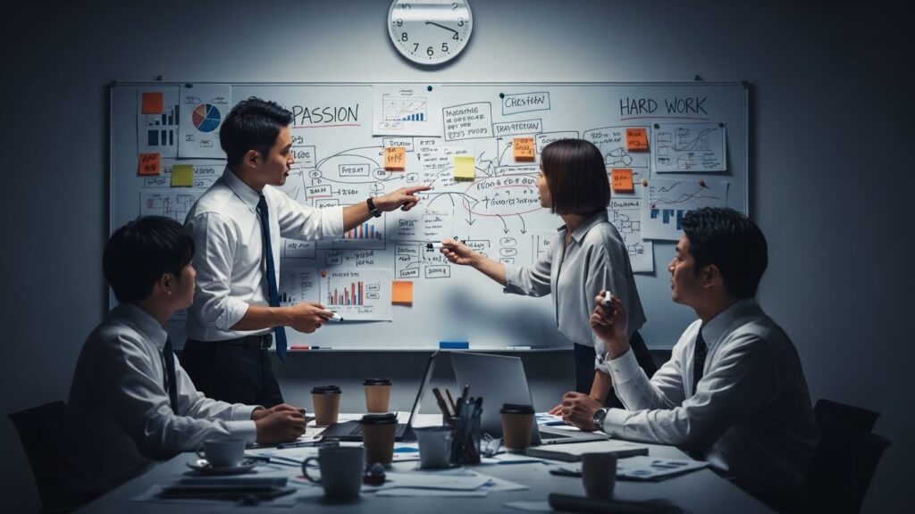 加えて、結論が出るまで帰れない、集中討議型の合宿です。 事実、時間を気にせず議論できる宿泊の強みを活かし、深夜までホワイトボードに向き合います。 疲れたら交代で仮眠をとり、また議論に戻る。 この「極限状態」を共に乗り越えた経験は、チームに強烈な自信と連帯感をもたらします。 これこそが、イノベーションを生むための、ある種スポーツのようなストイックな合宿です。