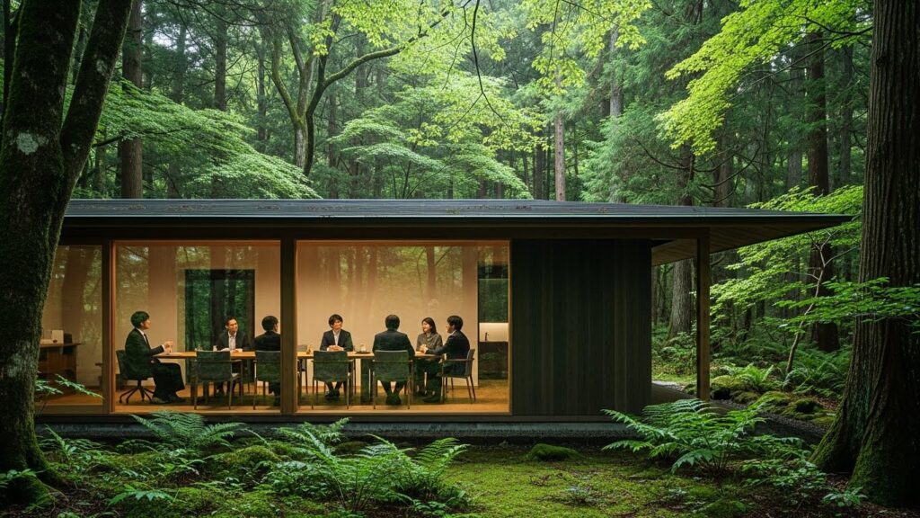 閉鎖的な空間では、思考も閉塞します。 そのため、当施設の会議室は、全面ガラス張りで森と一体化するように設計されています。 目に入るのは緑、聞こえるのは鳥の声。 例えば、行き詰まったらテラスに出て深呼吸をするだけで、脳に酸素が行き渡り、新たな視点が降りてきます。 言い換えれば、自然のエネルギーを借りて、思考の壁を突破するのです。