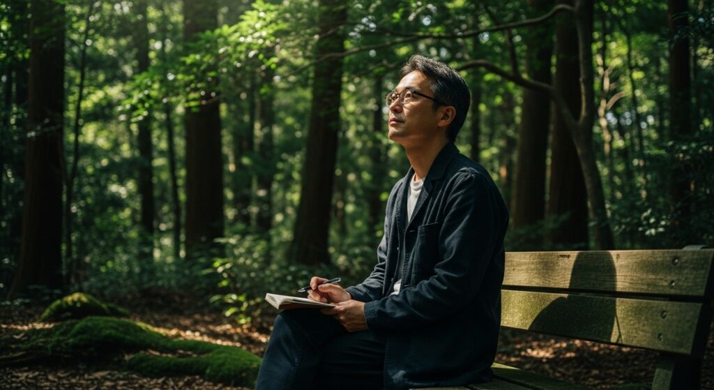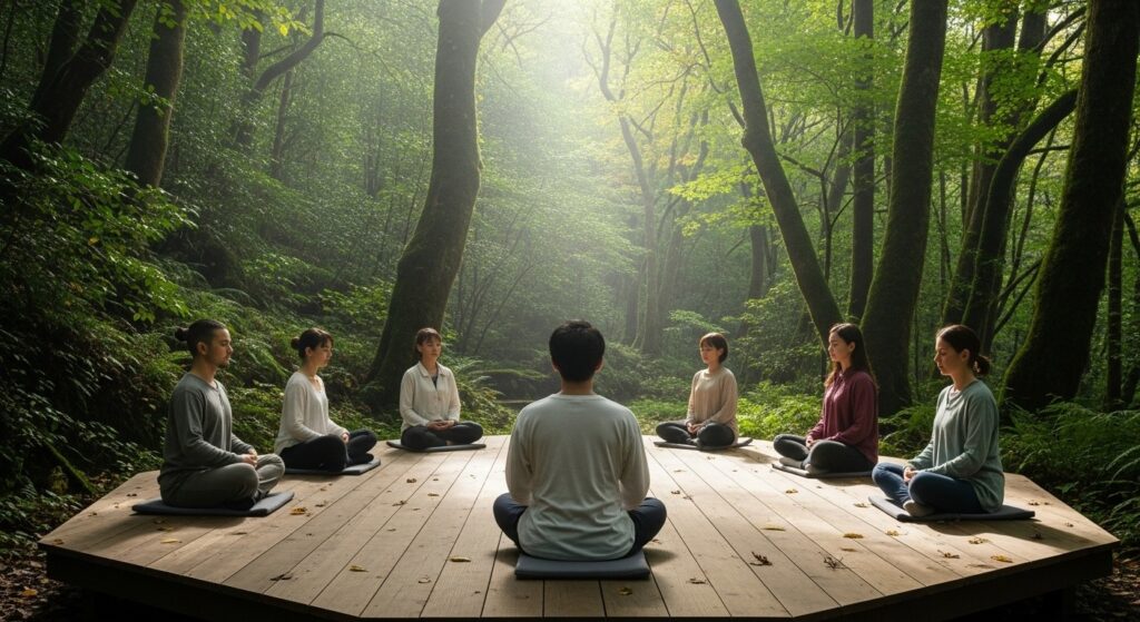 ・森林メディテーション(瞑想) 朝、鳥の声だけが響く森の中で座禅を組む。 「今、ここ」に意識を集中させることで、散らかった思考ノイズを鎮めます。 Googleやゴールドマン・サックスが研修に取り入れているように、瞑想はスピリチュアルではなく、科学的な脳のトレーニングです。