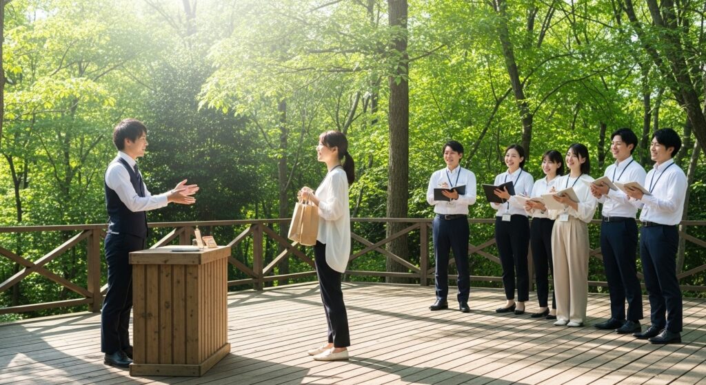 森の中の広場や、開放的なテラスを使って、接客ロールプレイング(ロープレ)を行います。 「クレーム対応」「おすすめ提案」「新人指導」など、テーマを決めて実演。