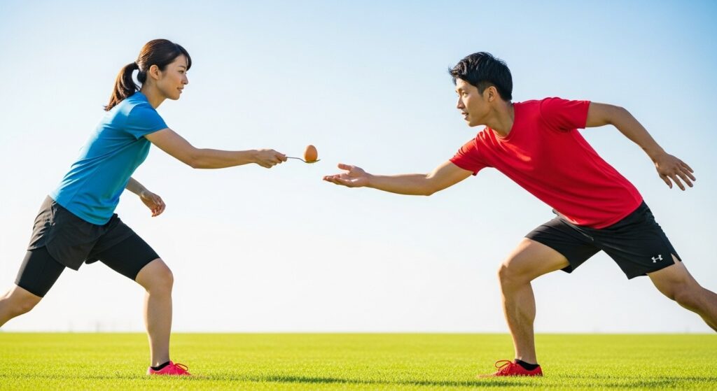 この「引き継ぎ」の難しさを体感するために、「チーム対抗リレー」を行います。 ただし、普通のリレーではありません。 バトンは「生卵(割れやすい案件)」や「水が入ったコップ(情報の鮮度)」です。 走るコースは、リゾート内の起伏に富んだオフロード。