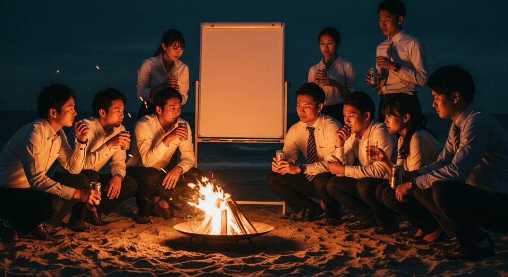 夜、焚き火を囲んで、アルコールを片手に「失注検討会」を行います。 ルールは一つ。「誰(Who)ではなく、何(What)が悪かったかを話すこと」。