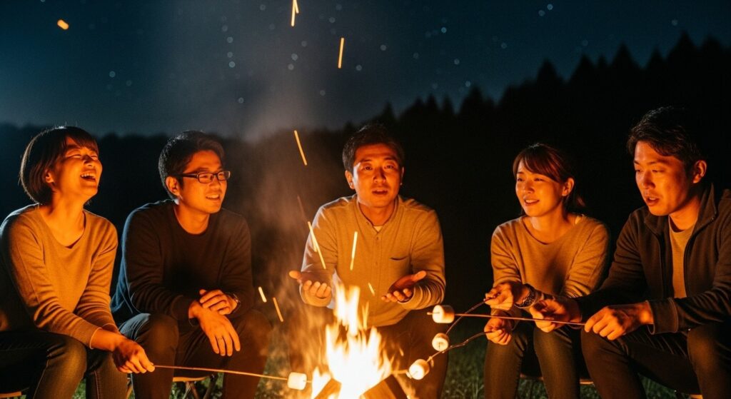 ● 夜の焚火で、チームは“本音のレベル”でつながる