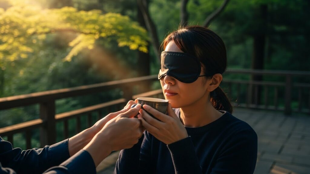 - 森の中で、目隠しをして様々な食材や水を味わう(ブラインド・テイスティング)。