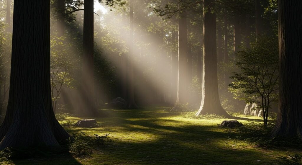 霧がうっすらと漂う杉林。