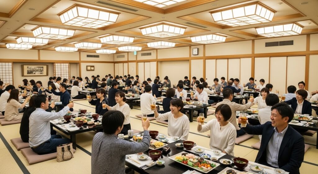 × もったいない例: 幹事が疲弊し、社員はただ飲んで終わり。翌日には何も残らない「コスト」。