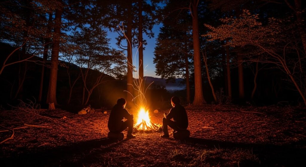 焚き火の前