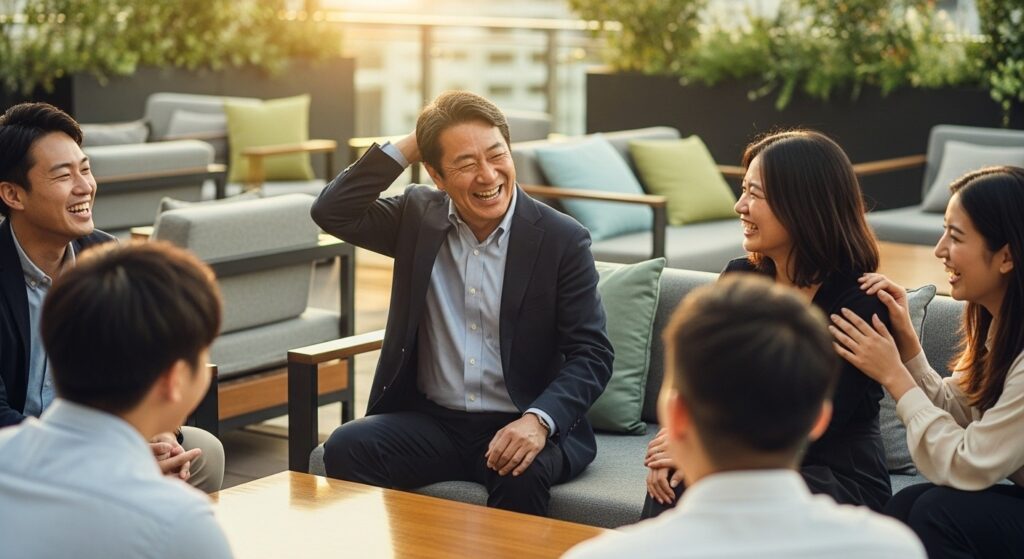 プロパー:「〇〇さん、意外と抜けてるところあるんですね(笑)」 中途:「いやー、実は体力には自信なくて。助かったよ、ありがとう」