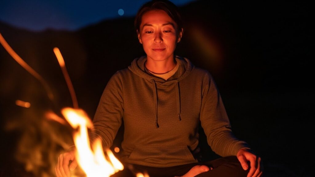 「焚き火の炎を見つめてください」 不規則に揺らぐ炎は、飽きることなく視覚を捉え続け、自然と深い集中状態(トランス)へと導きます。
