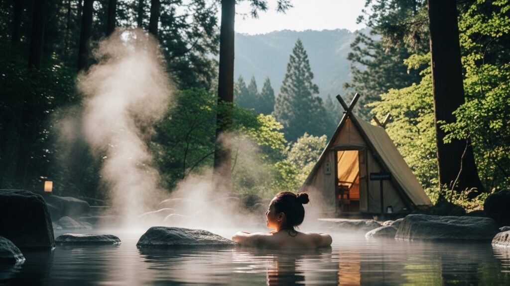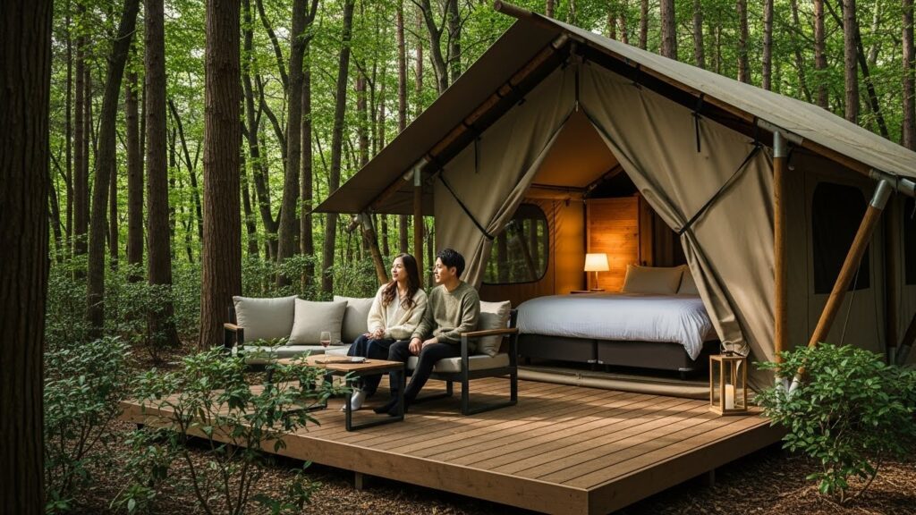 マグマリゾートが用意するのは、森の中に設営された最高級のグランピング・テントです。 「テント」と言っても、そこは五つ星ホテルを超える快適空間。 ふかふかのベッド、こだわりの家具、そして専用の焚き火スペース。
