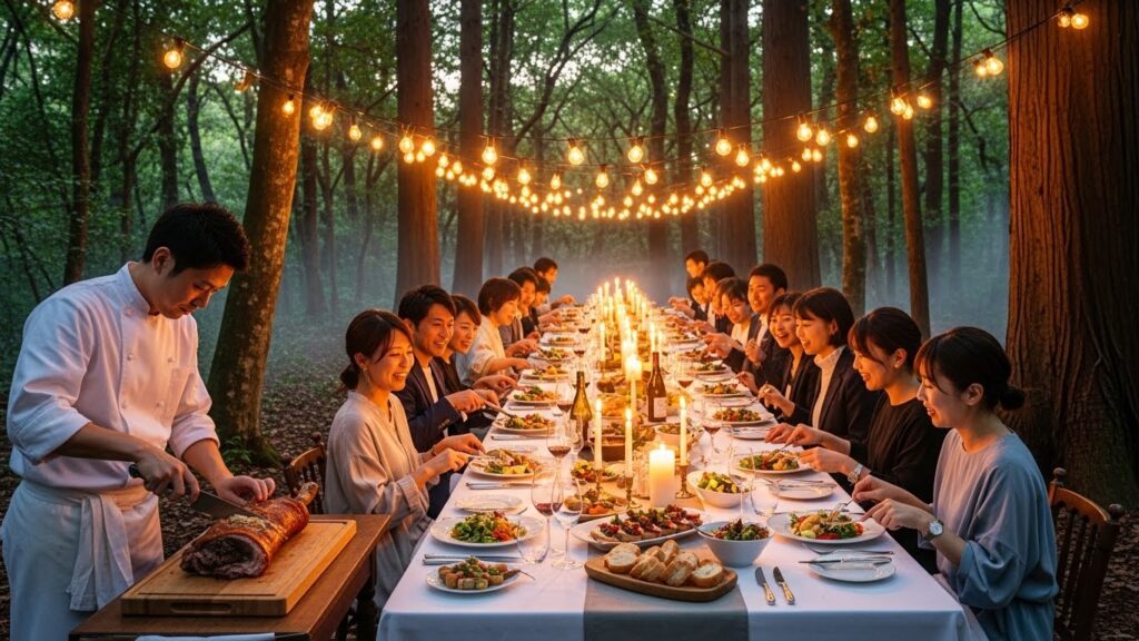夕暮れ時、森の中に突如現れる、白いクロスが敷かれたロングテーブル。 屋根はありません。空の下のレストランです。