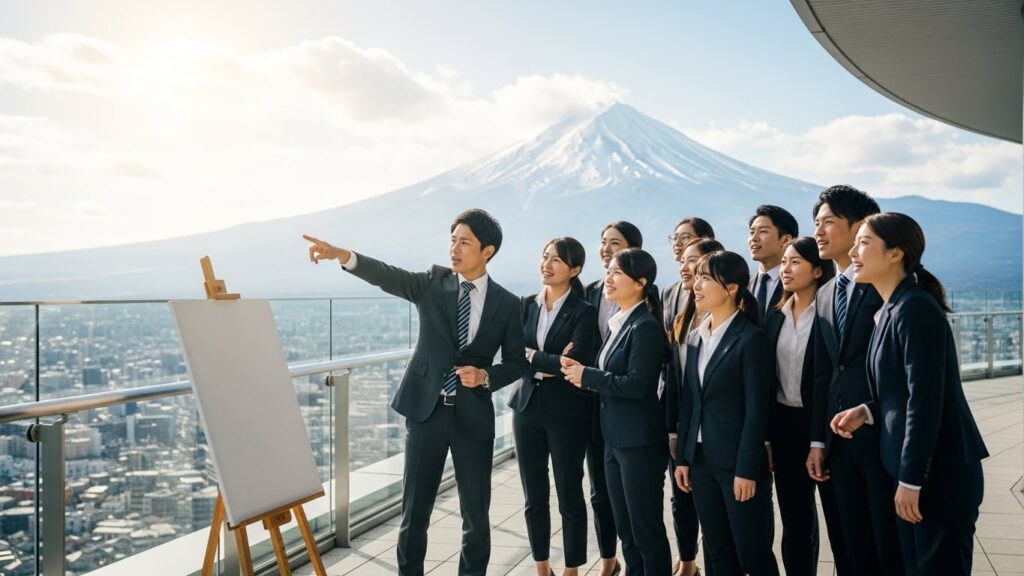 閉鎖的な会議室ではなく、視界の開けた屋外テラスや、ガラス張りのホールで行うプレゼンテーション。 リーダーは、手元の原稿を読み上げるのではなく、目の前に広がる広大な景色を指差しながら語ります。