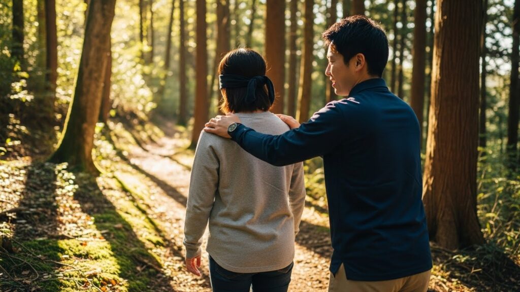 森の中で行う、ペアワーク。 一人が目隠しをし、もう一人が手を引いて道なき道を案内する。 視覚を奪われた恐怖の中で、頼れるのはパートナーの声と手の温もりだけ。