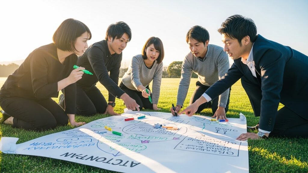 最高のキックオフを終えても、月曜日に出社して「さて、何から始めようか」と迷ってしまっては、熱量は急速に冷めていきます。 ロケットスタートを切るためには、具体的なアクションプランと、最初の小さな成功(クイック・ウィン)が必要です。 熱狂を、冷徹な「計画」へと落とし込むクロージングです。