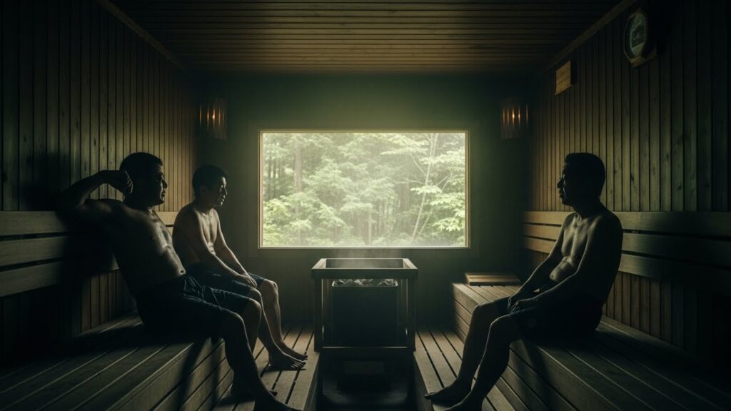 森の中に佇む、薪焚きの本格サウナ。 照明を落とした薄暗い空間で、社長も役員も、全員が一糸まとわぬ姿で汗を流します。