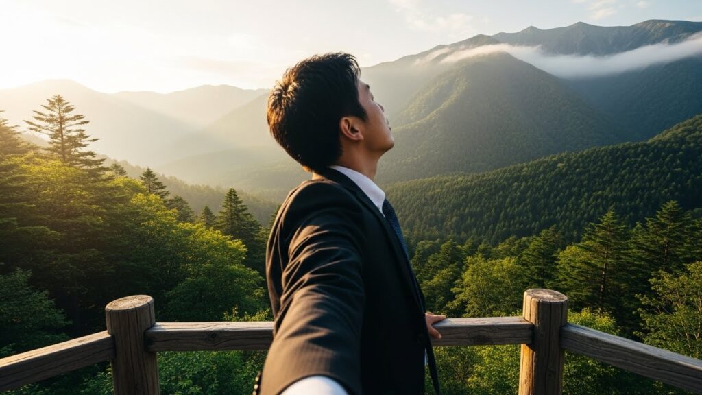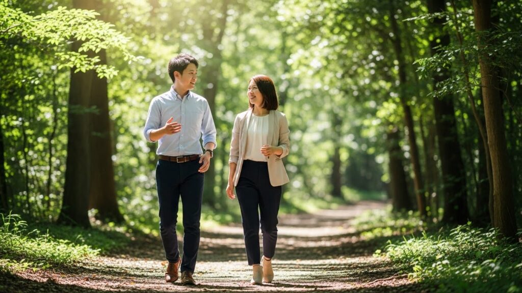 森の中を並んで歩く。ただそれだけで、会議の質は劇的に変わります。 並列に歩くことで、上司と部下が対立構造(対面)ではなく、同じ方向を見る(並走)関係性になります。また、足裏から伝わる地面の感触、肌に触れる風の温度、森の香りが五感を刺激し、脳内の神経伝達物質(セロトニンやドーパミン)の分泌を促します。